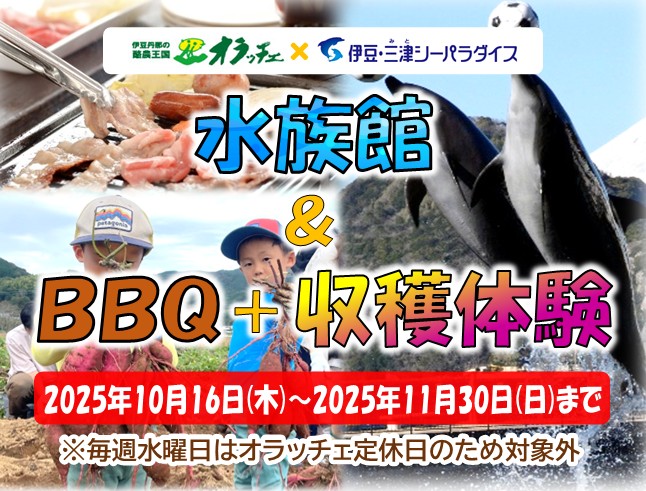 詳しく見るお得な満喫プランが登場!! 伊豆・三津シーパラダイスとオラッチェの体験がセットになりました。 「水族館」とオラッチェの「BBQ」「収穫体験」がセットになったコラボプランです!1日を楽しく…